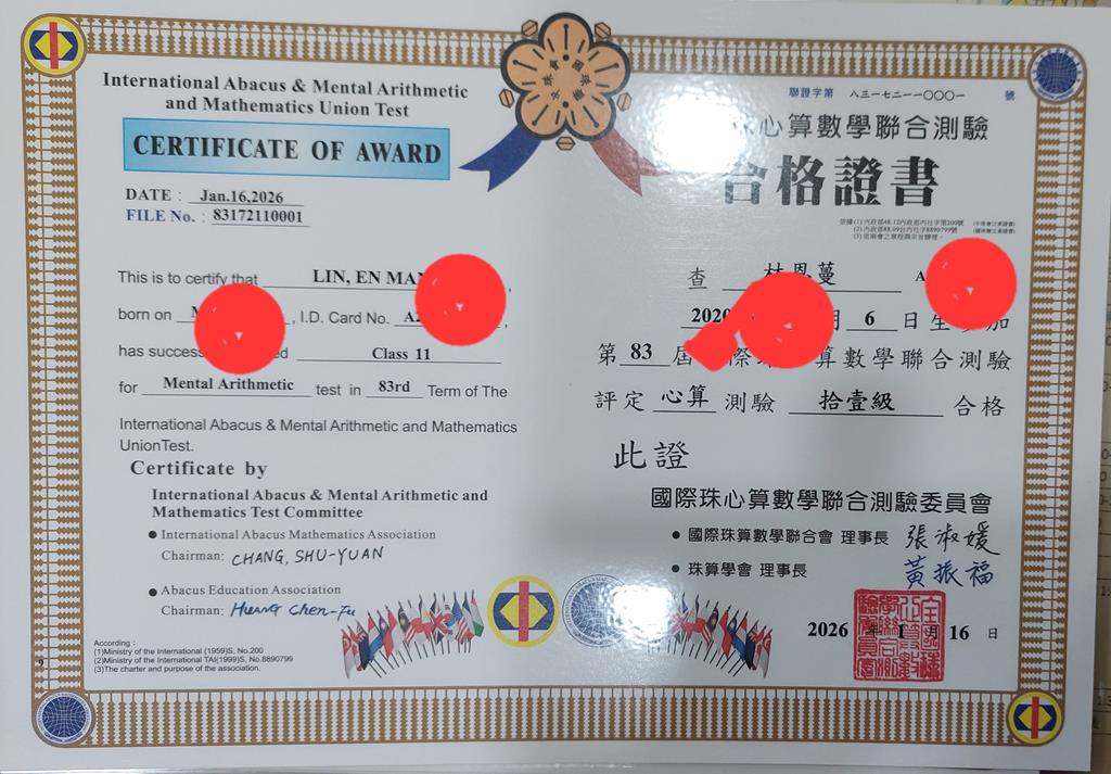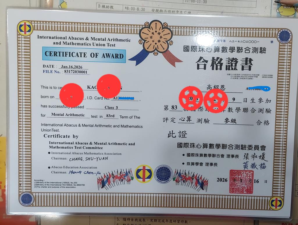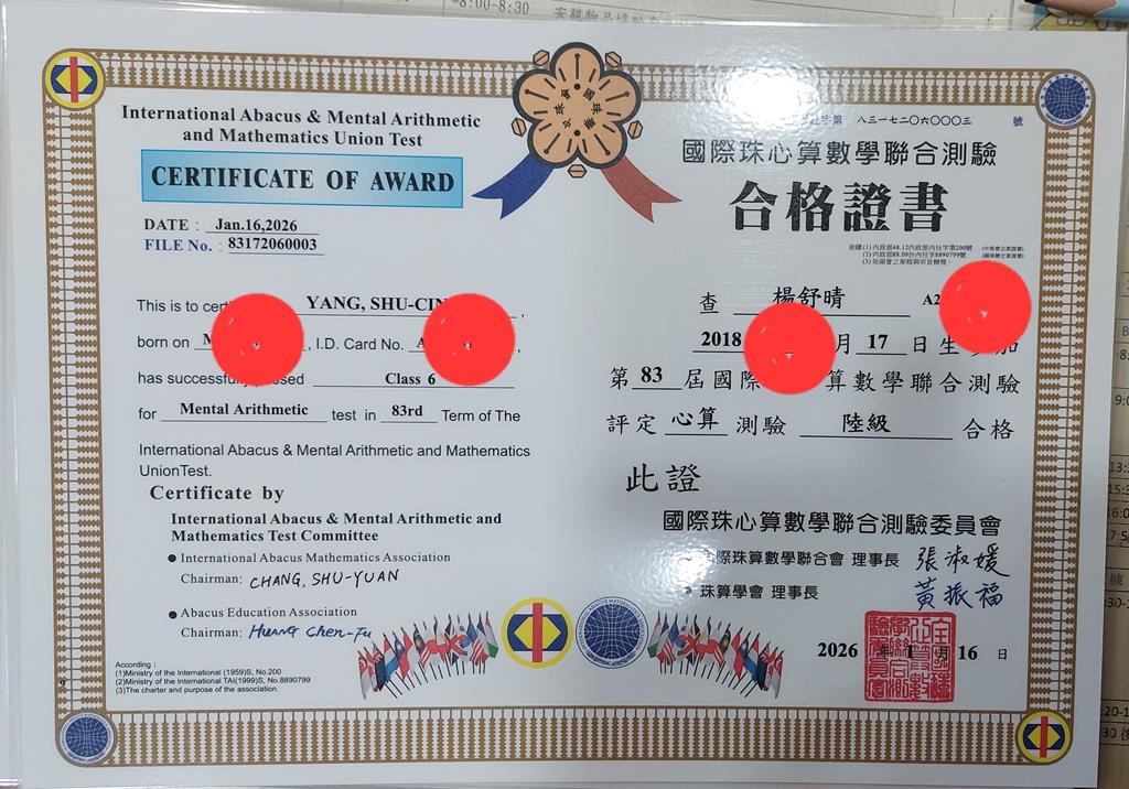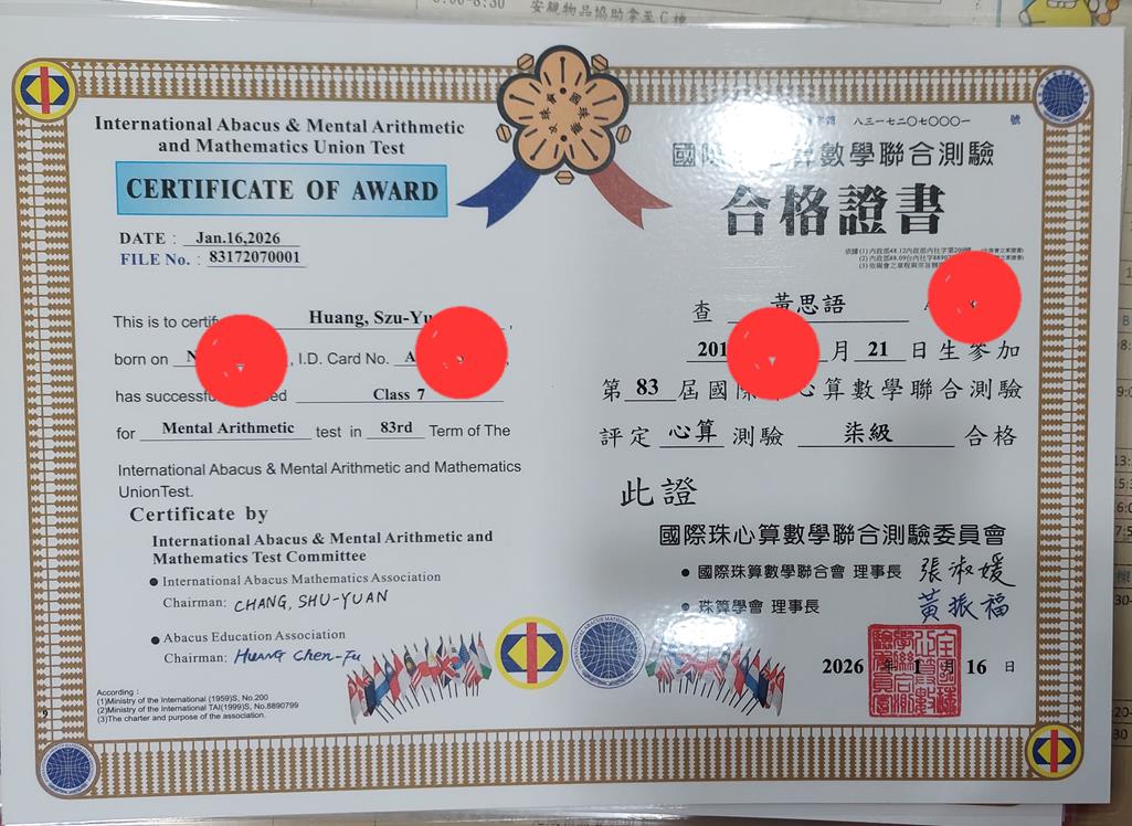 相簿名稱: 115.03心算檢定合格證書